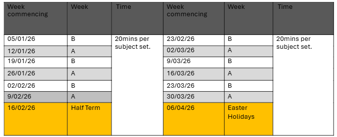 Homework that is timetabled on a Monday is checked on a Tuesday. This pattern follows for the week. Work set to be completed on a Friday is checked on the following Monday. This is to ensure students are actively completing homework revision, little and often.