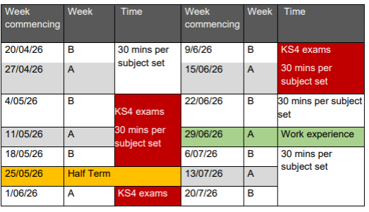 Homework timetable: